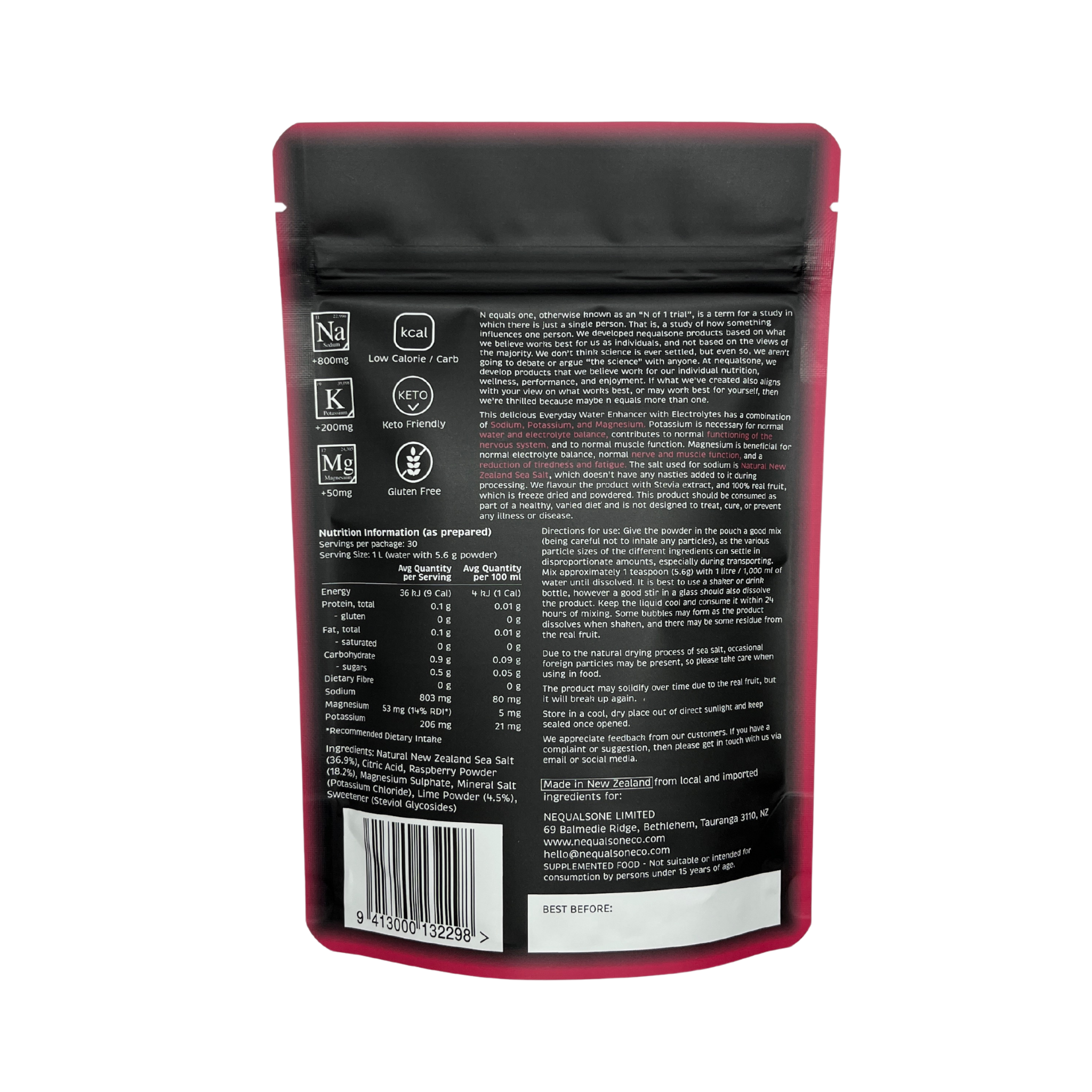 nequalsone Everyday Water Enhancer with Electrolytes is a delicious, New Zealand-made flavoured water enhancer containing a combination of sodium, potassium, and magnesium.